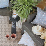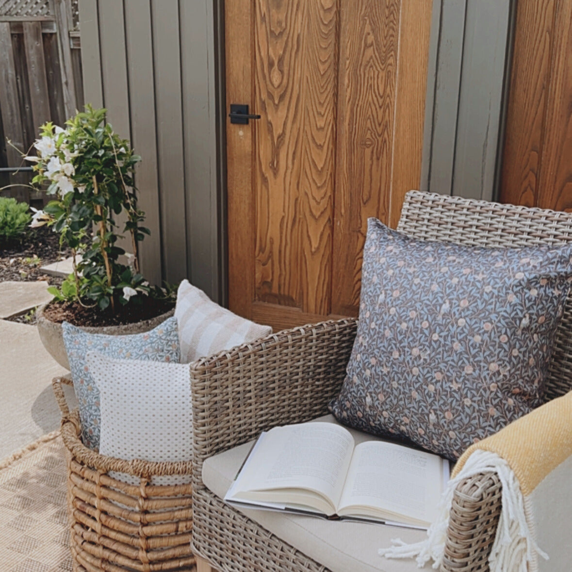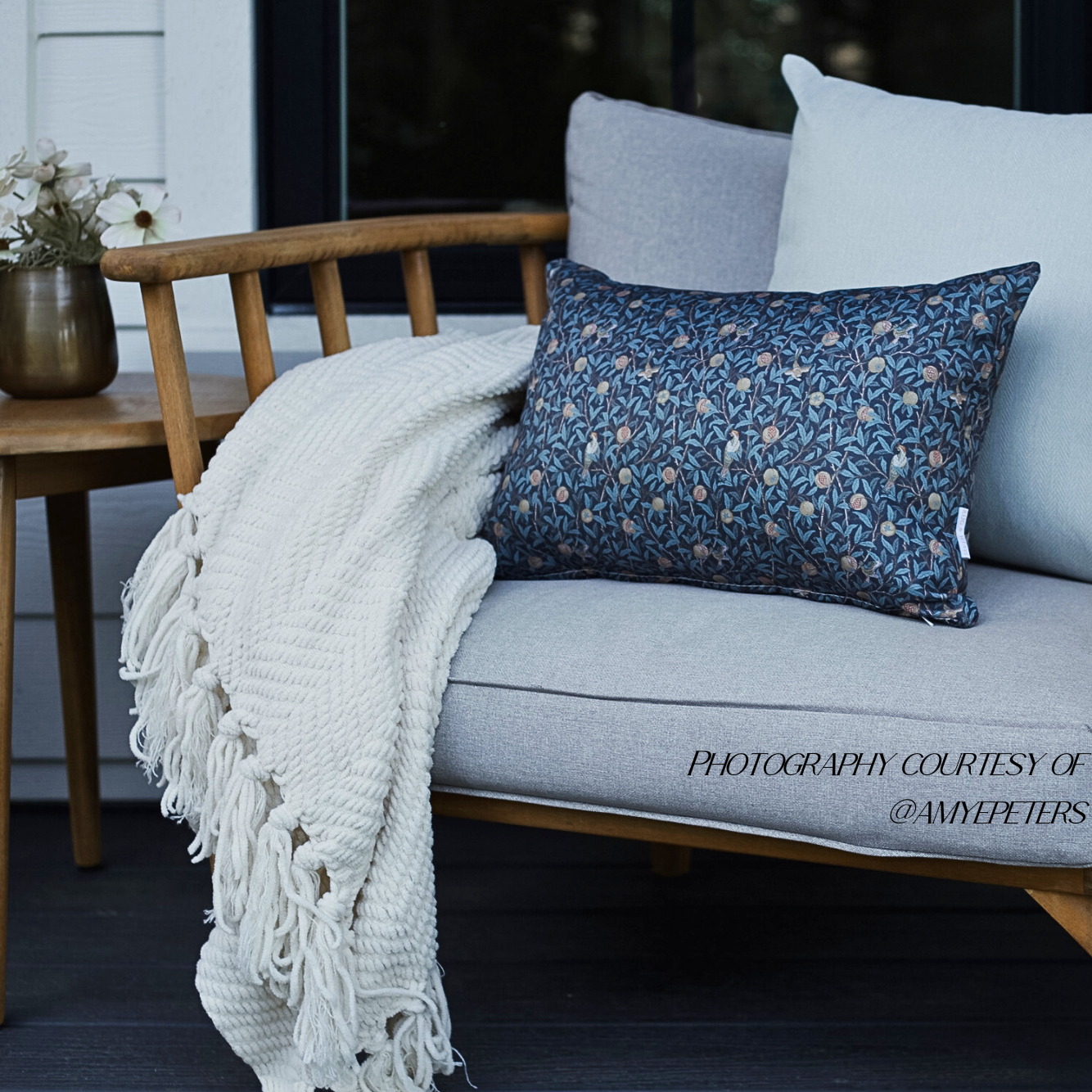 Our Paloma Outdoor Pillow features a William Morris inspired print, featuring a charming bird amongst foliage and pomegranate fruit. A moody background adds even more character to this striking pillow. Make a statement this summer with this unique pillow!