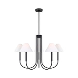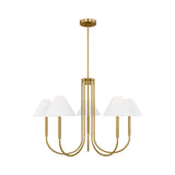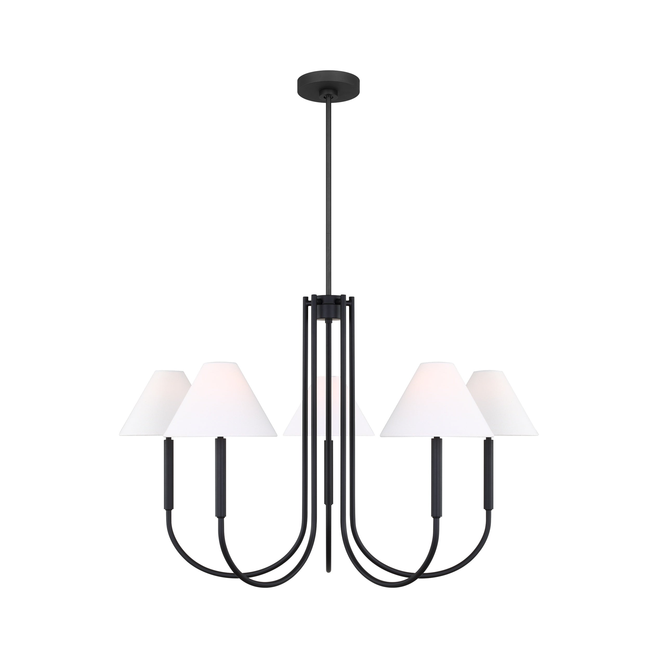 This redesigned J-arm style chandelier collection seamlessly integrates contemporary and classic influences, showcasing extended candle tubes and empire-style shades.