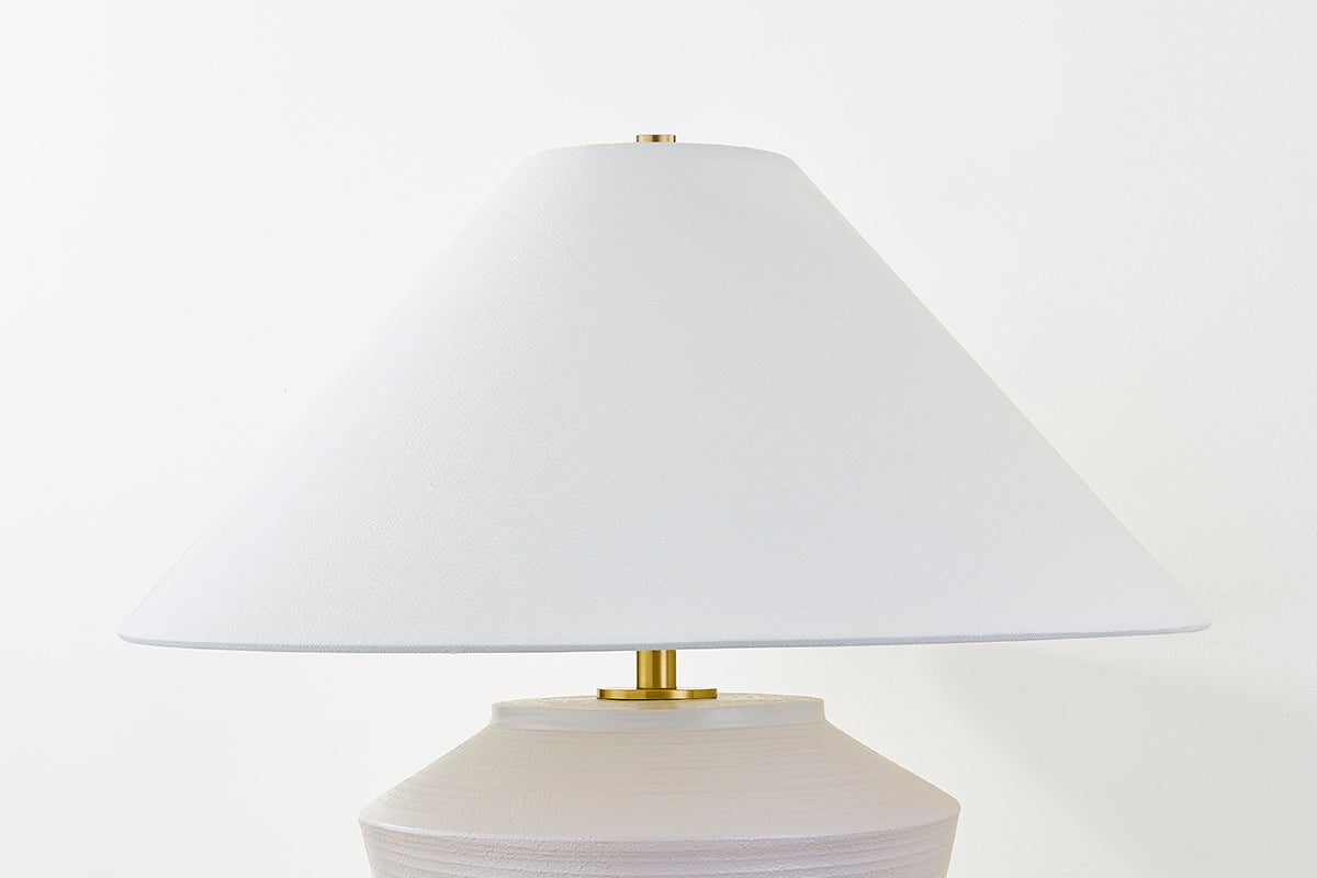 Inspired by the raw beauty of the desert, the Rachie Table Lamp features a whitewashed terracotta body and an Aged Brass frame for a refreshing and surprising contrast. The angular tapered white linen shade adds a textural element to your space. Professional, informative, and objective.