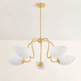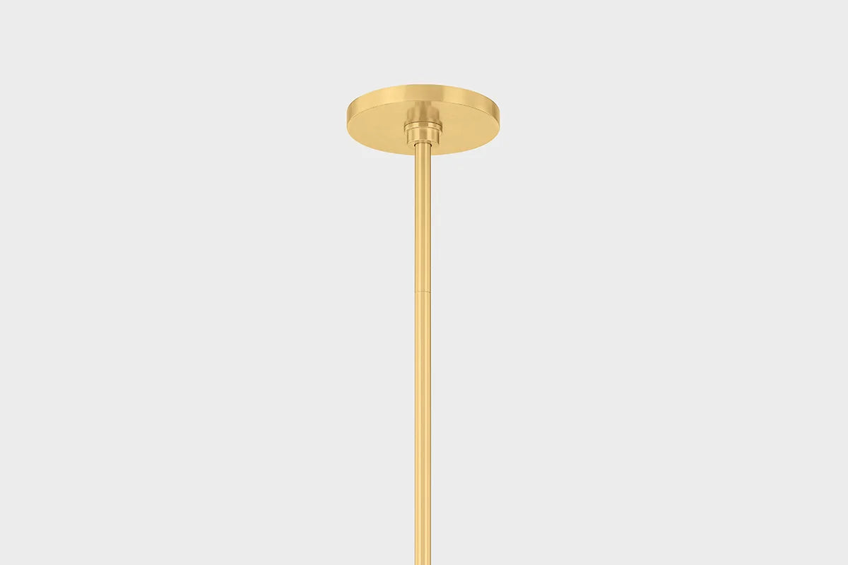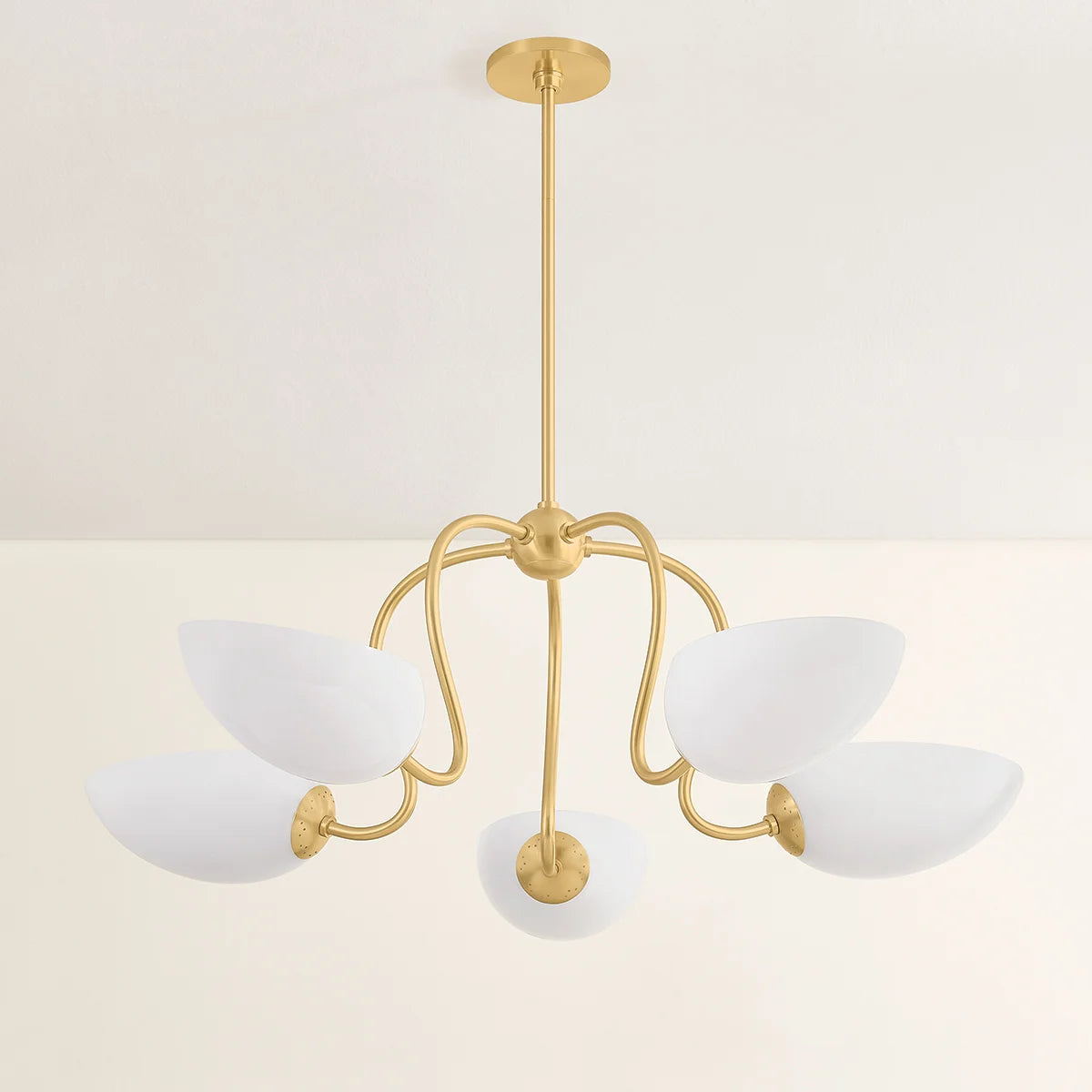 The Reva family leans into a sense of vintage nostalgia. Drawing on a botanical motif, the silhouette’s stem-like arms swoop dramatically into an S-curve to support each leaf-shaped uplight. The elongated cloud glass shades feature inner etching, diffusing light softly across a space. In both the semi-flush mount and chandelier, the classical design lines of Reva shine with a warm Aged Brass finish.