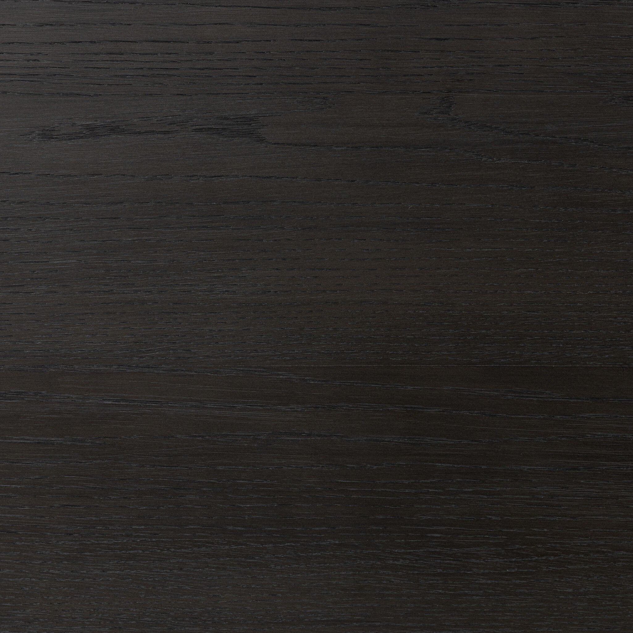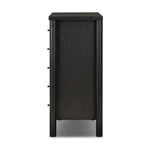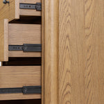 Create storage space in the bedroom with a five-drawer dresser of amber-finished oak. Chunky dowel legs support a tall silhouette and overhang top, all finished out with simple gunmetal hardware.