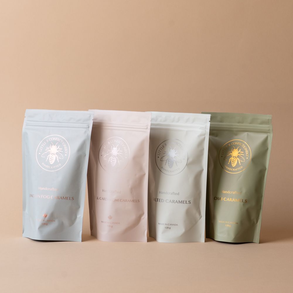 Crafted in small batches, these caramels are hand-cut and individually wrapped, using premium Canadian ingredients. Each piece is delicately finished with flake sea salt from Vancouver Island Salt Co., highlighting a proudly Canadian-sourced confection.