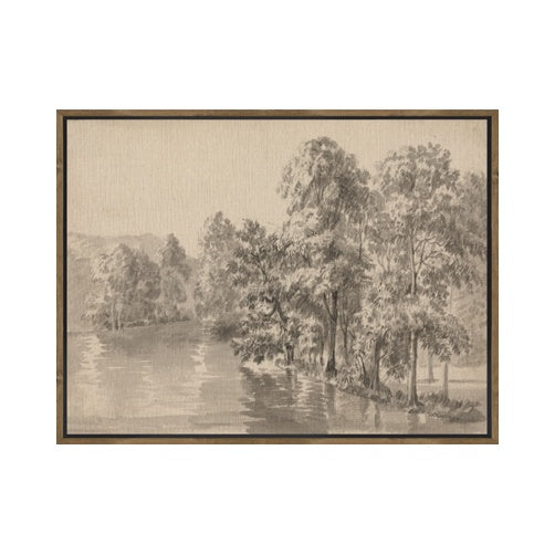 The "Sepia River" Framed Canvas displays a sepia sketch of trees by a river, set in a faux wood frame. Its vintage style adds warmth and elegance, enhancing any space with timeless charm.