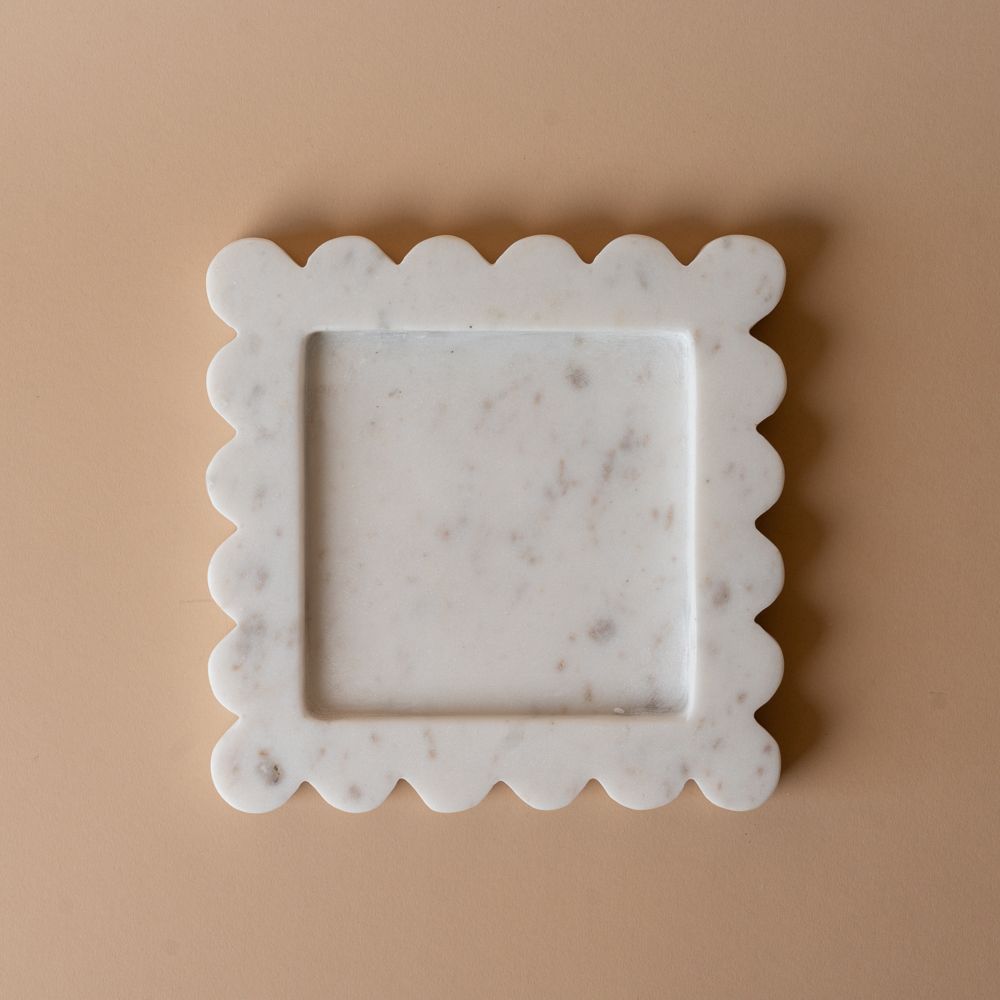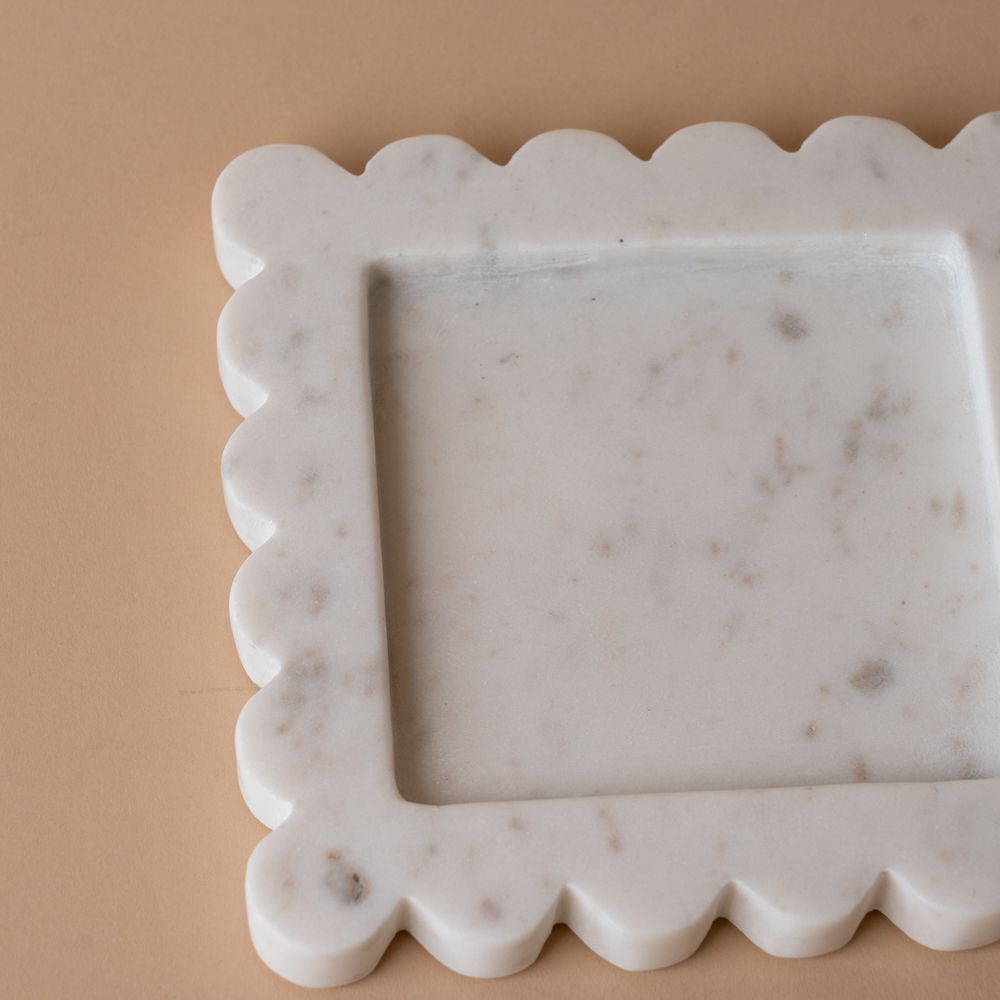 This adorable tray with a scalloped edge can be used for styling, as well as functionality in the entryway or bathroom. Use as an extra layer in coffee table styling styling, or as a base for perfume bottles and skincare, or as a home for trinkets and keys.