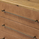 Bring a Nordic, material-driven look to your bedroom with a six-drawer dresser of grain-rich oak and drawer fronts covered with tan top-grain leather. Finished out with long, linear iron hardware.