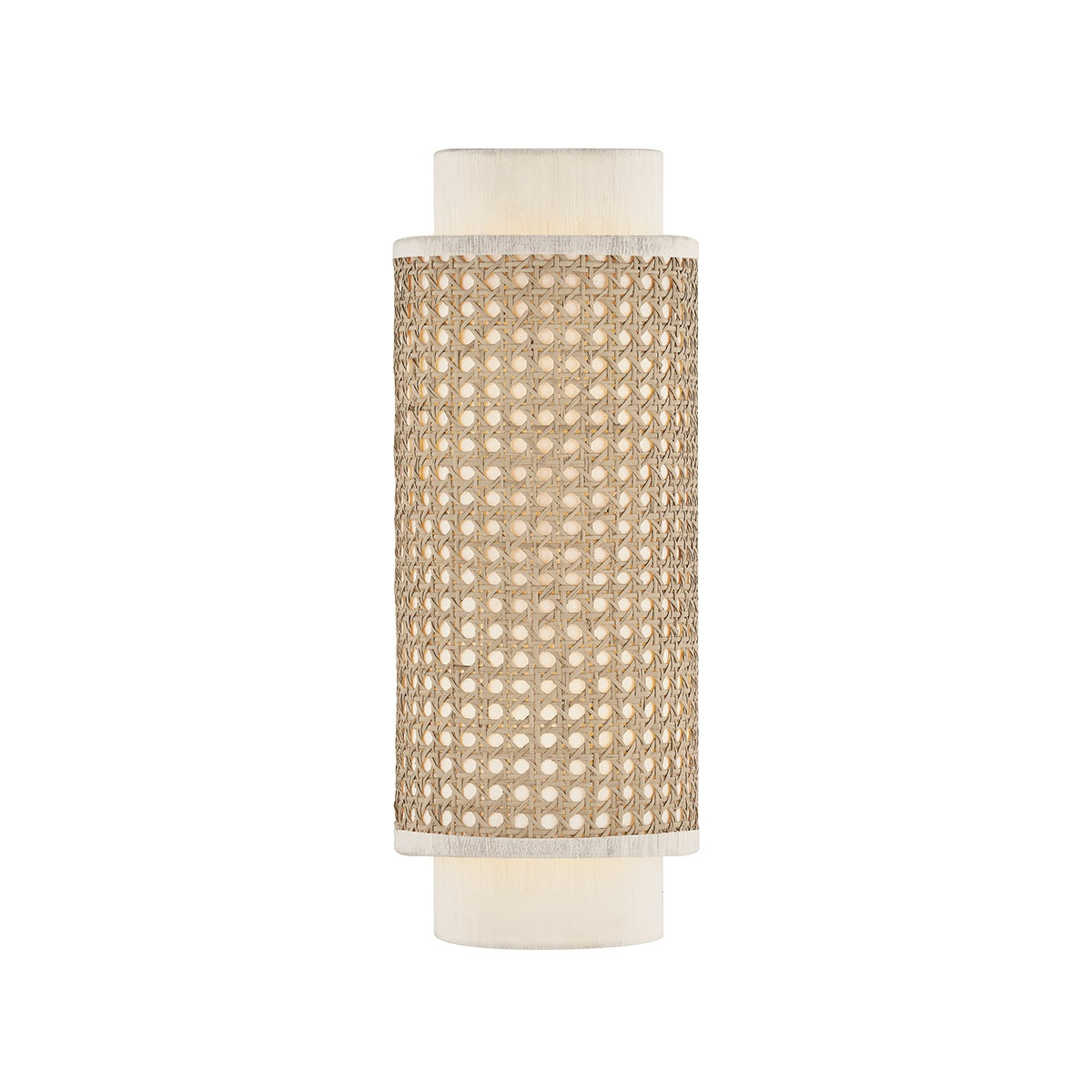 Natural materials, handcrafted detail, and soft layering create the charming and usable Tina sconce. A curved raw silk shade forms a tunnel that shields the light, while the outer basket cane wicker layer creates a textural point of interest. A warm, inviting glow fills the shade, bouncing off concealed Aged Brass hardware and softly spilling from both ends to wash the wall.
