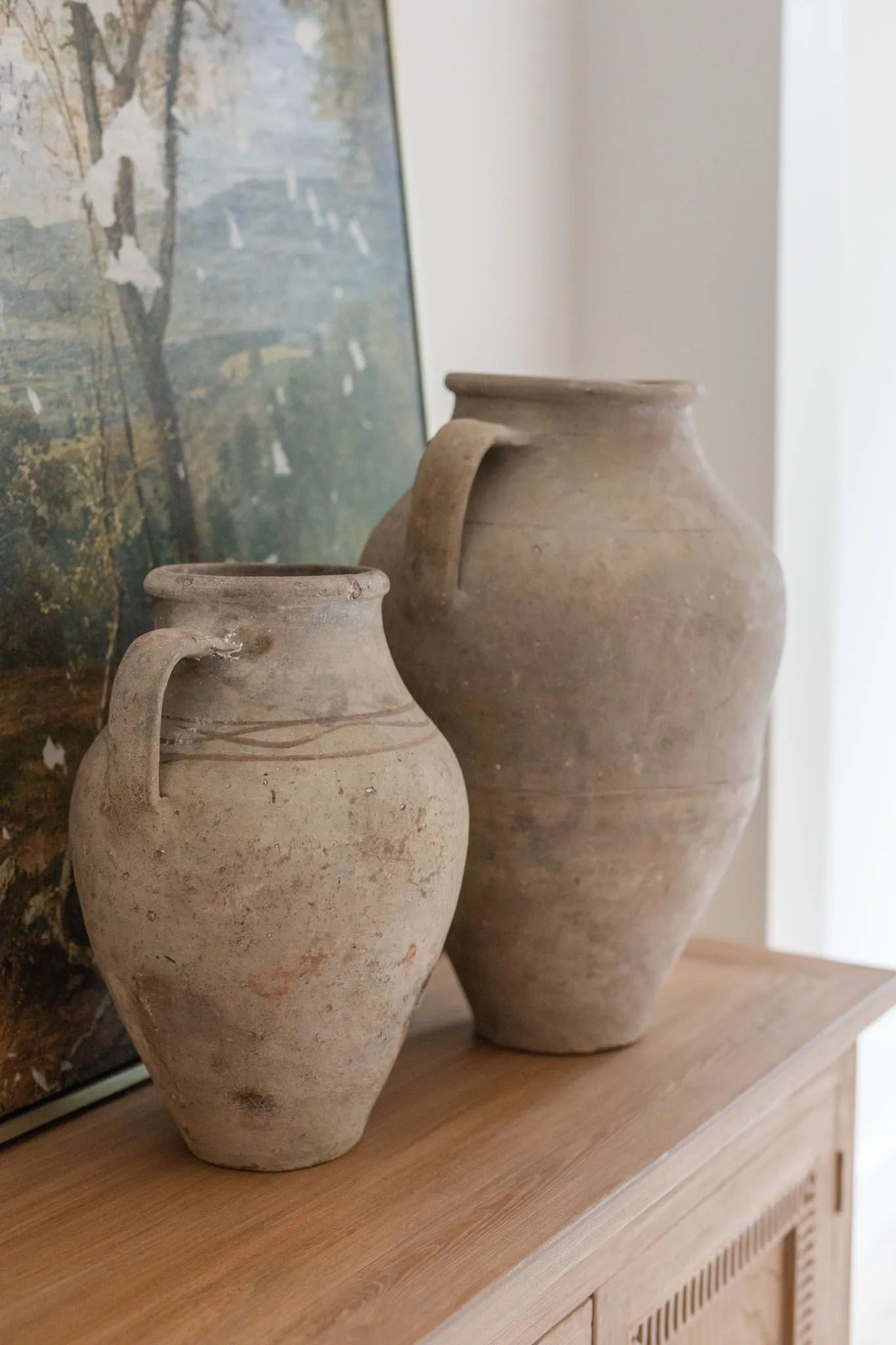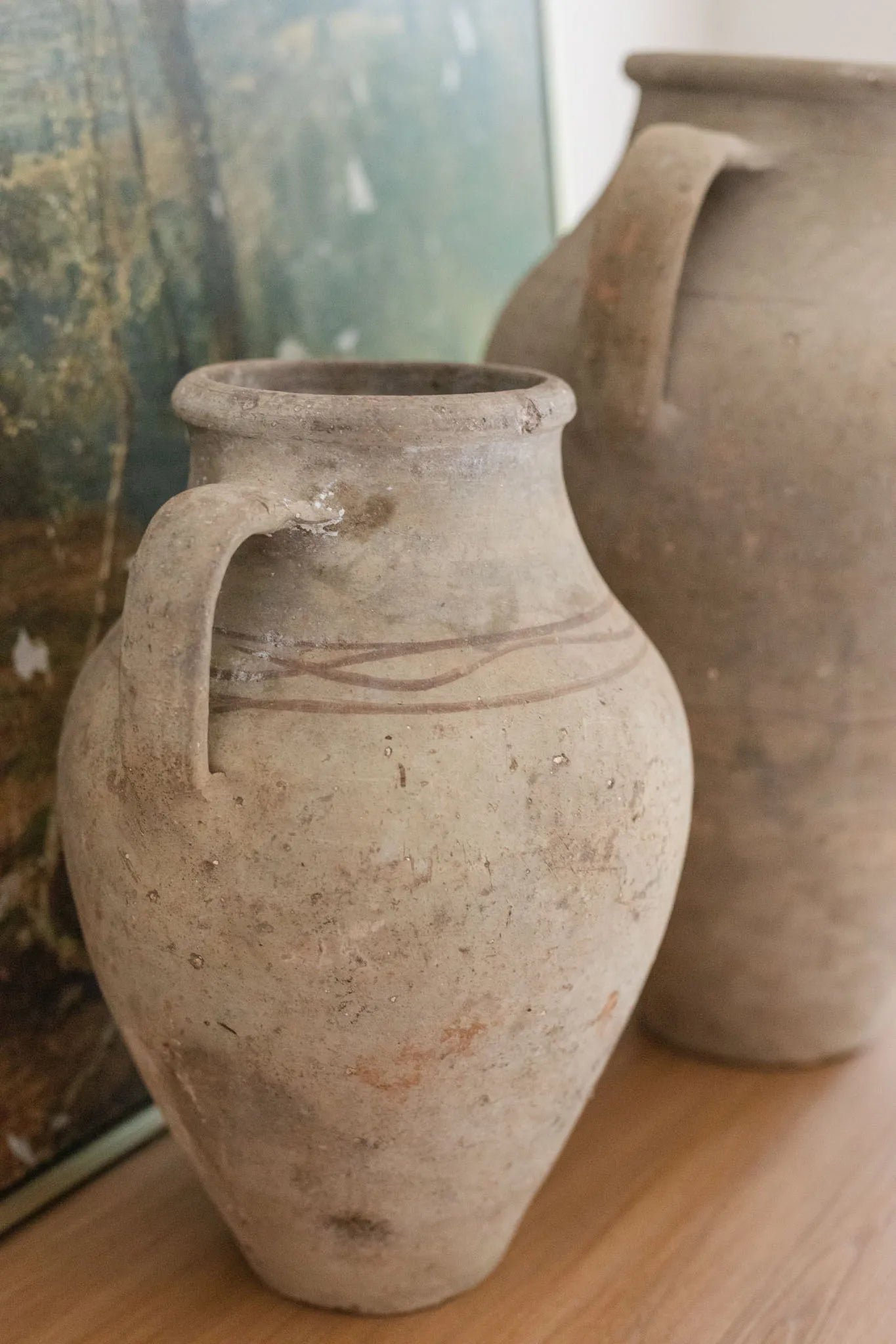 These exquisite Turkish Pots are each a captivating piece steeped in history and tradition. Crafted between 80 to over 150 years ago, these pots have weathered the passage of time, gaining a rich patina and an aura of timeworn charm that speaks volumes about their storied past. Originally designed for storing olive oil, fermenting wine, and preserving water, these pots carry with them the legacy of centuries-old practices. Every pot is a unique testament to Turkish craftsmanship and heritage, showcasing distinctive patterns, textures, and hues that reflect the passage of time and the hands that crafted them.