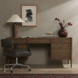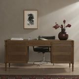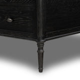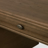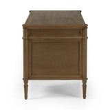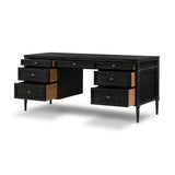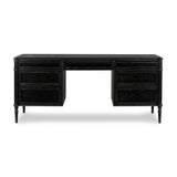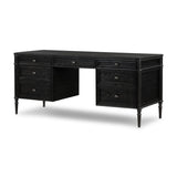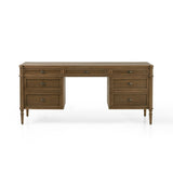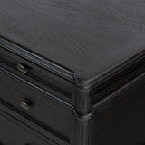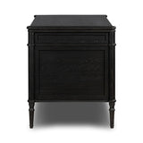 Drawing inspiration from classic European design, the Toulouse Desk exudes sophistication and charm. It features framed panels, softly rounded edges, and aged brass drawer handles, complemented by tapered spindle legs that add a touch of warmth. Crafted from solid oak and veneer with a distressed black finish, this desk offers timeless elegance and durability.