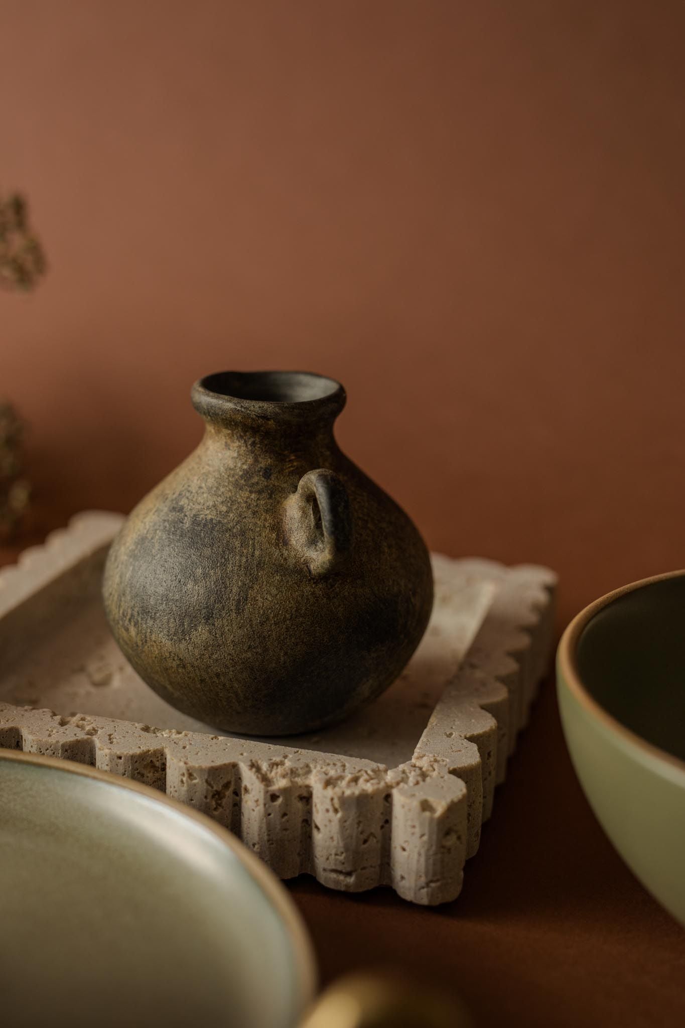 Exquisitely crafted in India from a singular block of travertine, this scalloped tray imbues both practicality and artistic charm to any surface. Each unique design ensures a distinct and exquisite addition to your home, encompassing a timeless heirloom-like quality.