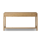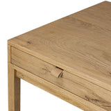 With a clean Parsons-style frame, a beautifully streamlined desk of light, worn oak is elevated with three top-grain leather drawer pulls. Cord management plus an out-of-sight outlet bring ease to the modern office.