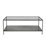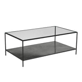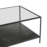 This striking piece features a glass tabletop paired with antique brass details, creating a distinctive industrial-glam aesthetic that commands attention in any room.