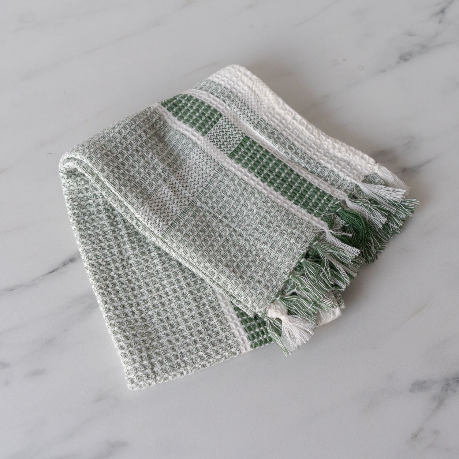 Soft chambray threads are woven together to create a waffle texture, perfect for drying hands and dishes in the kitchen.